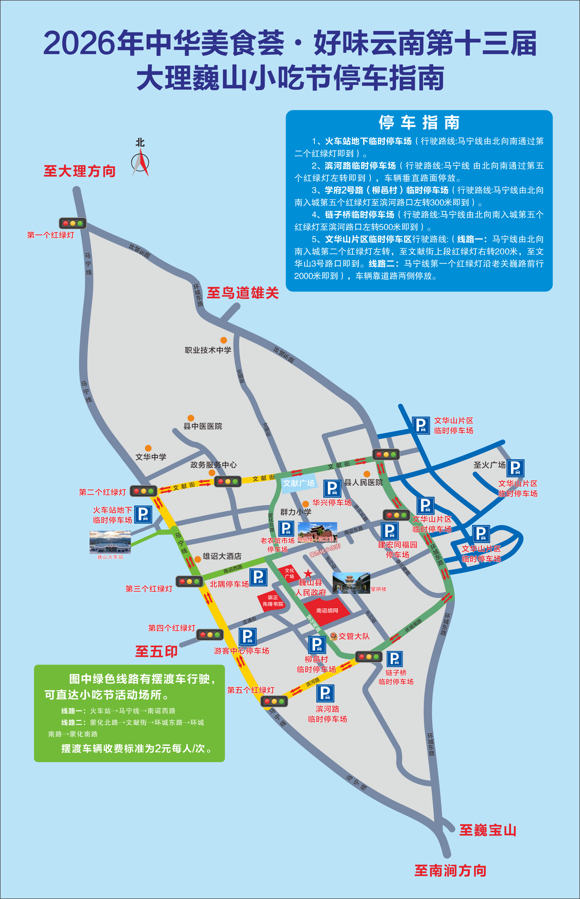 (三)在县城交通限行时段行车线路以红河源路←→滨河路←→环城南路←→环城东路←→文献街←→红河源路进行环行,在环行沿线设有火车站停车场、游客服务中心地下停车场、滨河路临时停车场、学府2号路西侧临时停车场(柳邑村)、链子桥临时停车场(原牲畜市场)、文华山临时停车场、北隅公园停车场、北隅停车场、华兴停车场等主要停车场地,同时设有观光车辆对游客、群众进行摆渡直达小吃街。