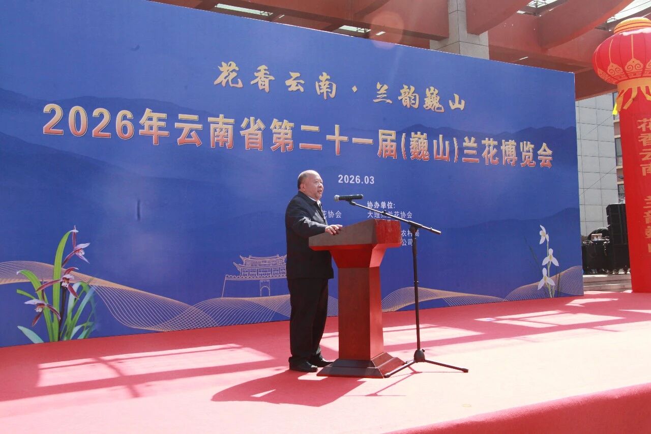 中国花卉协会兰花分会会长朱根发致辞并宣布开幕。朱根发表示,此次云南省第21届(巍山)兰花博览会在巍山县举办,旨在通过各级兰花协会的共同努力,共谋促进兰花产业的发展,在品种培育、科技创新、市场开拓、三产融合、与文化相融合的全产业链上的发展,共同推动我们兰花事业蓬勃发展,让兰花真正成为造福广大人民群众的幸福之花。