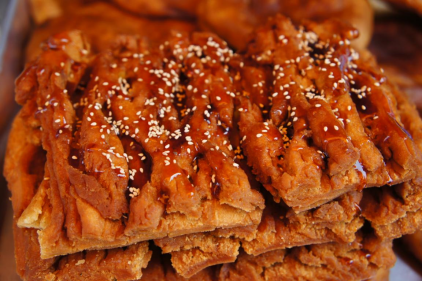 树皮则是用油香面加上少许熟香油,面要硬,和成团在一根圆滑的棍子上捏,称为“捏树皮”,捏好后用刀子一划,面上的花纹极像树皮,切成方块,放到油锅里煎,煎黄煎酥,搽上稠糖稀,撒上芝麻即可食用。