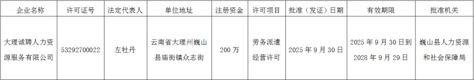 依据《中华人民共和国行政许可法》、《中华人民共和国劳动合同法》和《劳务派遣行政许可实施办法》的有关规定和程序,经巍山县人力资源和社会保障局审查,大理诚聘人力资源服务有限公司符合法定条件,拟发《劳务派遣经营许可证》,现将有关情况予以公示。
