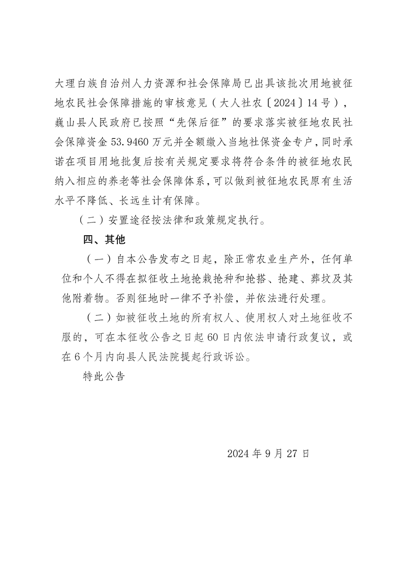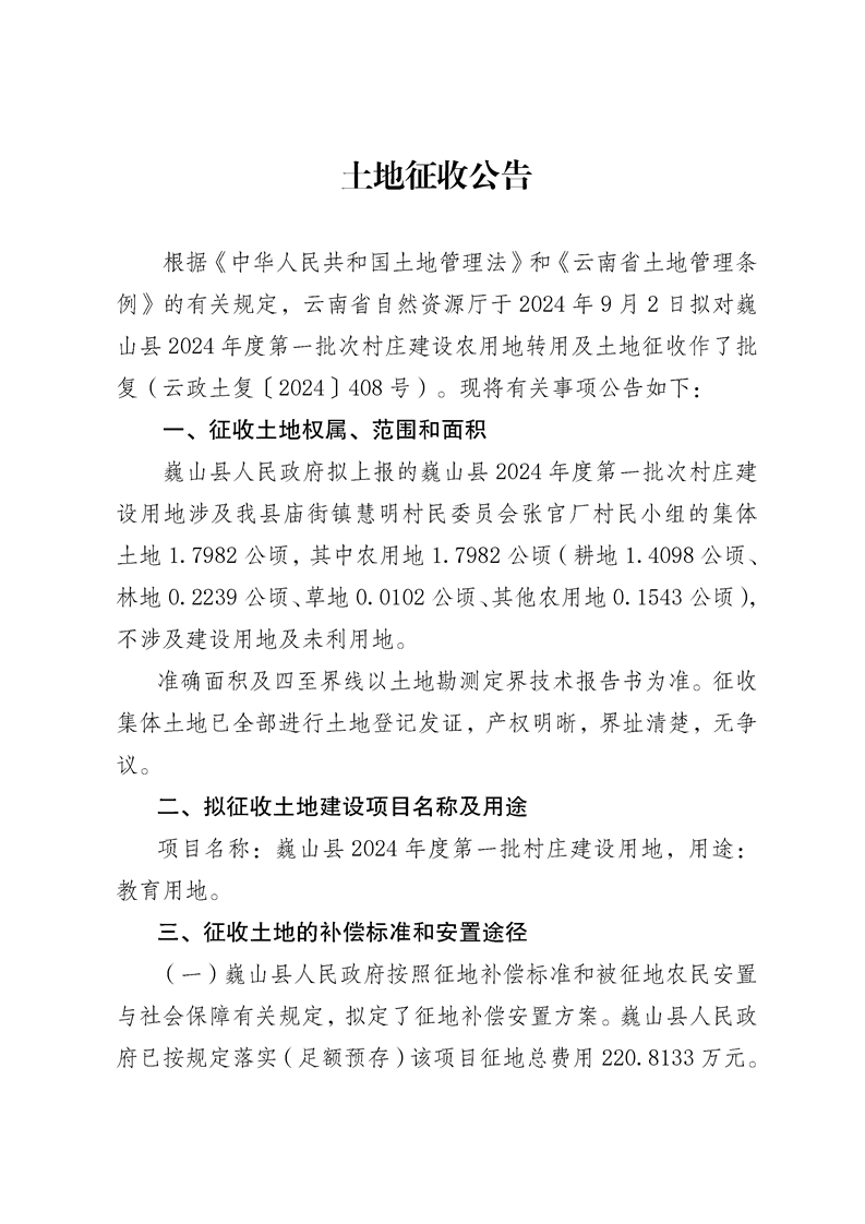 巍山县2024年度第一批次村庄建设用地土地征收公告
