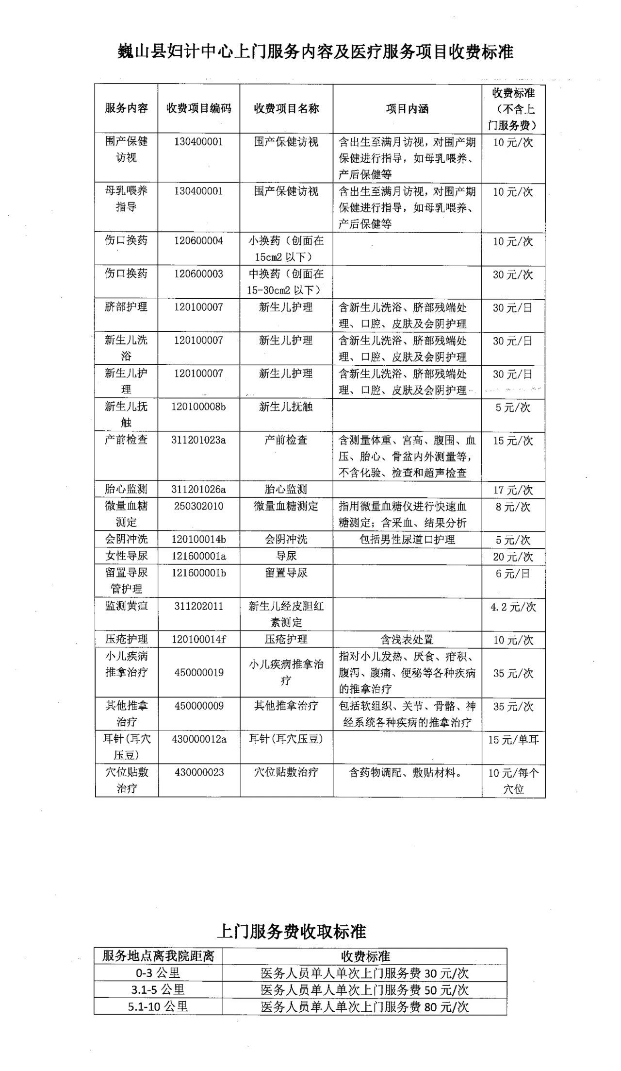 采取“医疗服务项目收费 + 上门服务费”方式收费,上门服务项目诊疗费按照《大理州医疗服务价格项目汇编(2024版)》线下医院同价收费标准收取,上门服务费经成本核算向巍山县医保局备案,按服务地点离我院距离收取,即医务人员单人单次上门服务费:0-3公里30元/次;3.1-5公里50元/次;5.1-10公里80元/次。